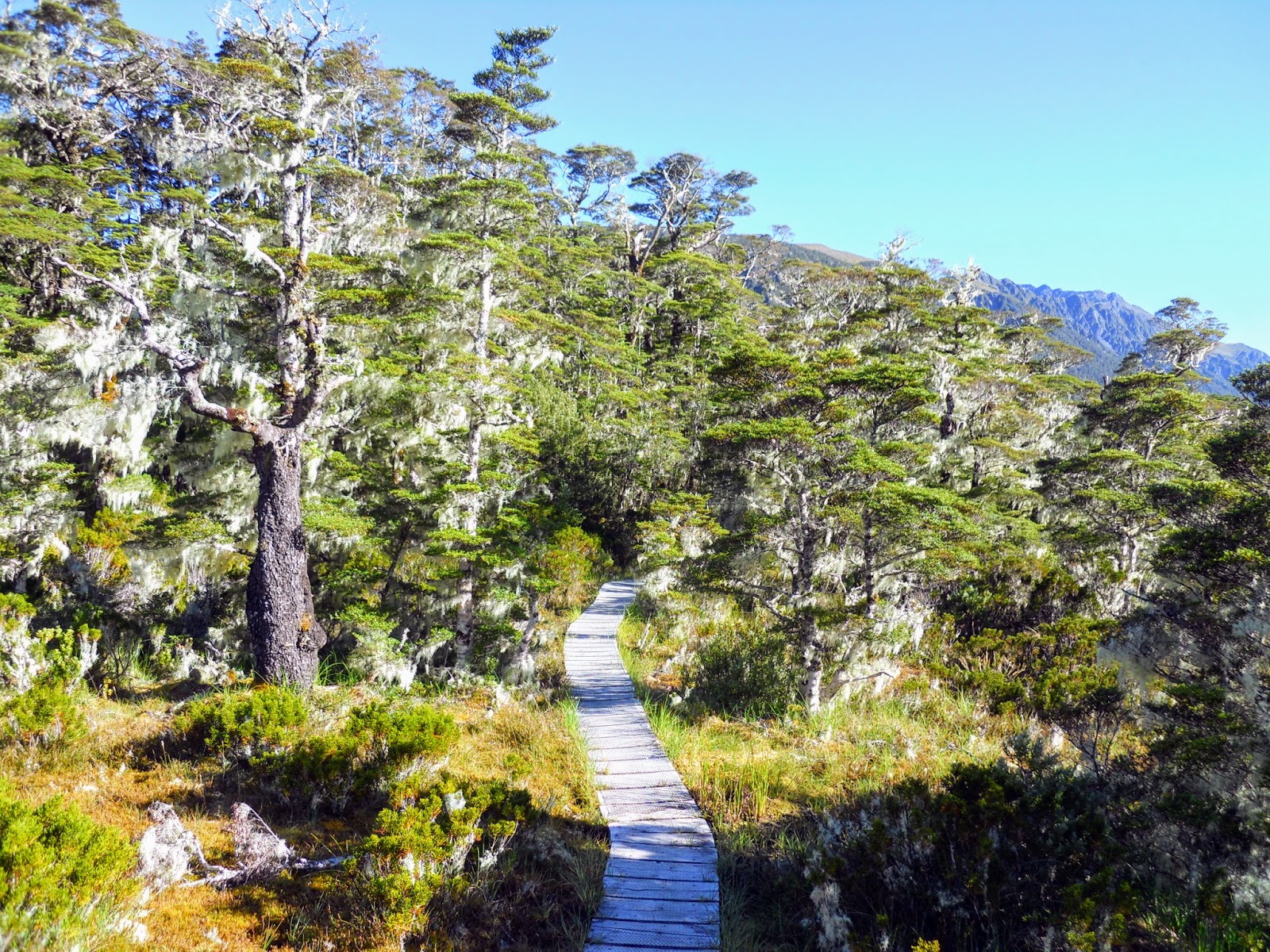 The track condition is generally good with plenty of boardwalk, track markers and a mostly finely benched track to follow. Later on as you pass Cannibal Gorge Hut the track gets a bit rocky and undulating under foot...